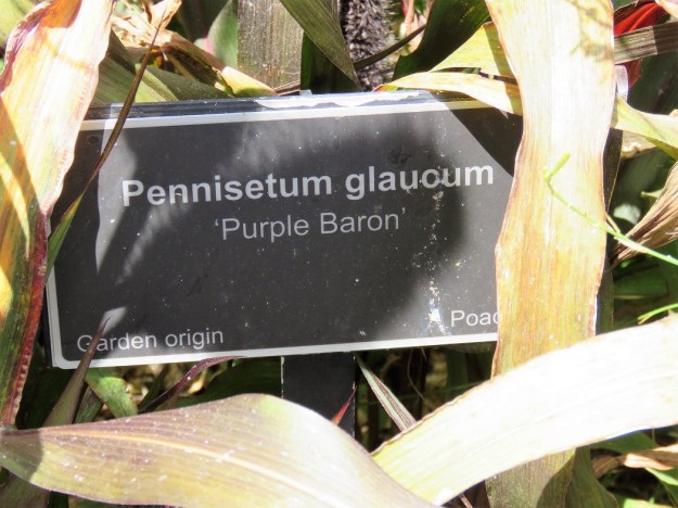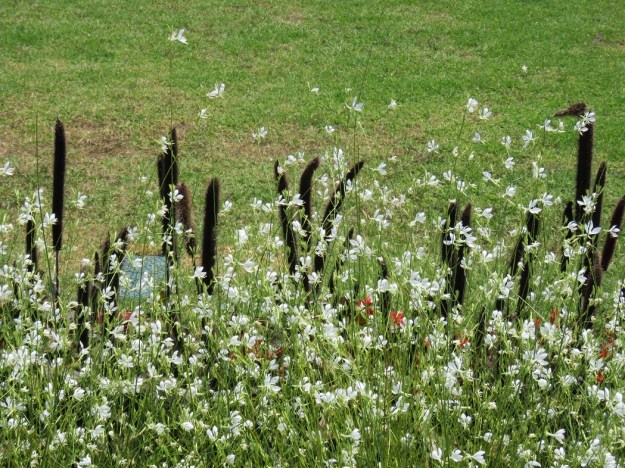 But look at the lovely seed heads on the pennisetum. I thought I needed this plant until I looked at the foliage. Pennisetums are classified as grasses and many have fine foliage. However, Pennisetum glaucum is actually millet, grown commercially for its grain harvest, though these named cultivars with purple foliage have been selected as decorative garden annuals rather than grain production. The foliage is closer to maize than a grass and while it may be possible to keep it lush and dark in a well cultivated and irrigated garden border, grown in harsher conditions, the foliage didn’t have a whole lot to recommend it. The seed heads did, though, especially in conjunction with the airy, waving gaura. In the interests of accuracy, I should perhaps add that there was a row of red bedding begonias in the front but I carefully framed my photo to cut them out. I am not a bedding begonia fan.