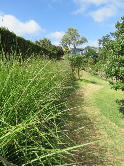 At first I thought it must be a mass planting of miscanthus but no, it is vetiver grass from India, botanically Chrysopogon zizanioides. I learned this from my friend and tour host for the day, the effervescent garden designer, Tony Murrell. Vetiver is apparently being widely promoted in Auckland for its erosion control capability. I looked it up. It puts its roots down four metres in the first year alone and is hardy to drought, prolonged flooding, fire, some frost and grazing. The roots can go down as far as six metres. By this stage, my eyebrows were pretty much reaching my hairline but it is apparently sterile and non-invasive so it doesn’t spread. And if you change your mind about it, you can use herbicides on it, though I can’t imagine digging it out without heavy machinery.