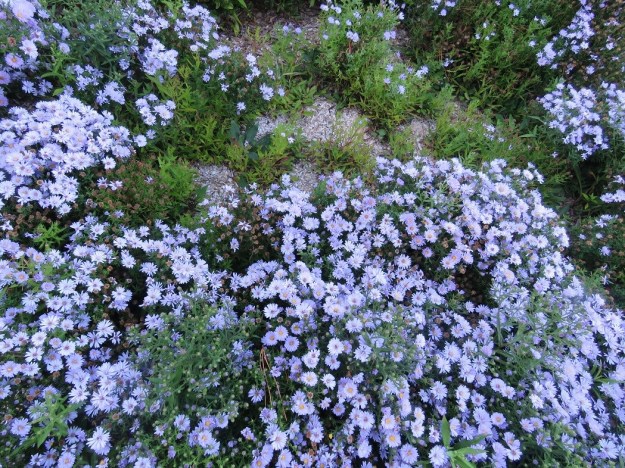 The advice with woodchip is to be careful to lay it on the top because it robs the soil of nitrogen as it decomposes if it is incorporated into the soil. Behold an example. I did the initial planting of this aster and laid mulch. I must have gone back into the area to add some more plants. Clearly, I was not sufficiently careful to scrape the mulch to one side and some of it was dug in when planting. The somewhat bare area and yellowish tinge to the plants are signs of nitrogen deficiency. I keep telling myself to get out and scatter a bit of blood and bone on the affected plants to combat this but we do not generally add fertiliser to our garden so I haven’t got around to it yet.
