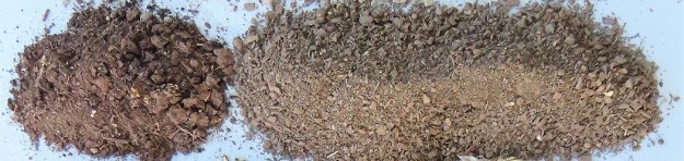 This is not a problem that you will have if you buy in bark chip because it won’t have fertiliser added (and not all fertiliser comes with a coating). To the right, is fresh(ish) bark that we still use as a potting mix. To the left is what it looks like after more than a decade in our bark heap. Despite being an organic product, pine bark does not decompose readily.
