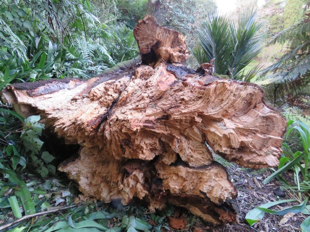 This cycle of nature has done quite a bit of damage but only to the understorey plants. While tawa is another of our native hard woods, we can’t get the timber out because of where it is. It will be the usual process of clearing the debris, getting out what firewood we can and stowing all the vegetative waste neatly in situ. The main trunk will remain where it is, embedded on legs formed by its own branches driven deep into the earth and it will outlast us. We will have to re-route a garden track so that it passes beneath the tree.