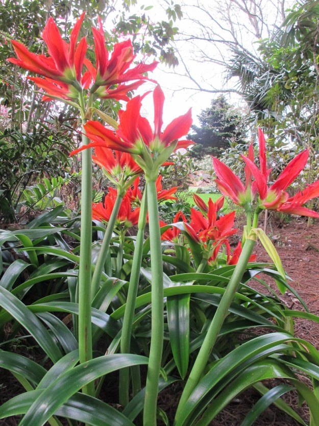 Hippeastrum aulicum in particular is a mainstay of our early spring woodland. I have always described it as looking more like a Jacobean lily. Because it thrives with us, we have a lot of aulicum though we don’t get seed on the plants in the garden. Mark says this is because we are not hot enough but it will set seed if brought under cover.