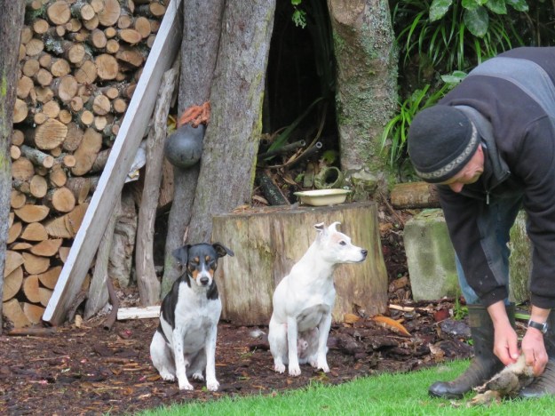 Dudley and Spike are line up waiting for breakfast – homekill possum