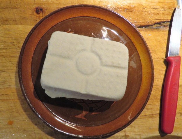 The recent gift of a Soyabella machine has revolutionised my life. It was a bit tedious and messy making soy milk with the food processor, strainer, muslin cloth and a big preserving pan on the stove. This handy little Chinese machine, not much larger than an electric jug, makes a litre of fresh, hot soy milk in about 15 minutes with close to zero human effort. It is a wonder, my Soyabella. And it has opened up the world of home-made tofu. Why home-made tofu? For us it is both a way of using our home-grown soy beans but also about drastically reducing the plastic that comes into the house. With the arrival of nigari this week, I made the first block of tofu and, between Soyabella and I, the hardest part of was finding the right-shaped weight to fit on top of the tofu block to press it. It was perfect, just like a bought block. Nigari is just a coagulant – mostly magnesium chloride – which separates the soy milk into curds and whey.