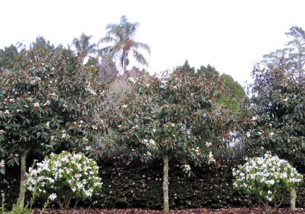 The lily border (currently empty bar Camellia yuhsienensis), backed by a clipped hedge of Camellia Fairy Blush punctuated with shaped Fairy Magnolia White all coming into bloom. Queen palms in the distance.