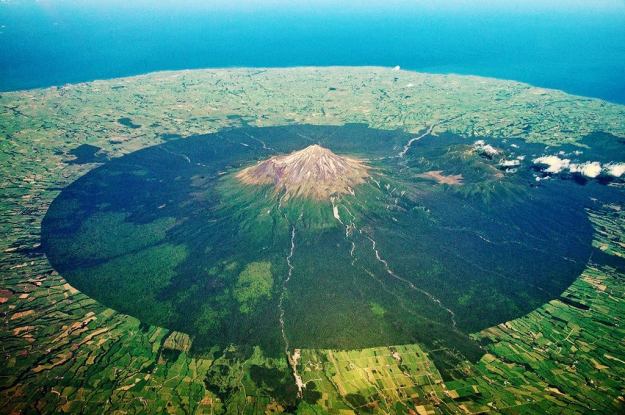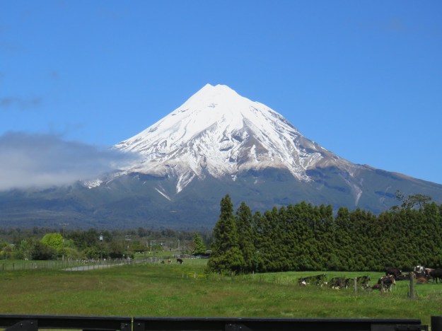 Flying in to New Plymouth from the south takes one over the mountain and on a clear day, the sight is breathtaking. It is a near-perfect cone sitting alone, very close to the sea and surrounded by what is called the ring plain – land that is rolling to flat farmland. Lacking my own image, I found this photo on Reddit. That is the Tasman Sea in the upper section. The dark circle around the lower mountain is where the native bush ends – the boundary of the National Park giving way to farm land.