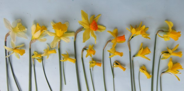 The snowdrop season is all but over already. It is charming but brief. The narcissi, however, have a longer season, at least in part because we can grow a much wider range of species and hybrids. Yesterday felt like a winter’s day – the last gasp of winter, I hope – so I headed out to pick one each of the many different varieties in flower. We don’t grow many of the larger ones at all, preferring the charm of the littlies, the dwarf ones. Bigger may be better when it comes to magnolias – at least in our eyes – but daintiness wins with the narcissi. Most of these are named varieties though Mark is also raising cyclamineus seedlings to build up numbers for planting out and to get some seedling variation within them. The cyclamineus are the ones where the petal skirt sweeps back, sometimes completely reflexed, giving them a slightly startled appearance. He was intending to plant many of these down in the park but hadn’t got around to it so offered them to me for the new grass garden.
