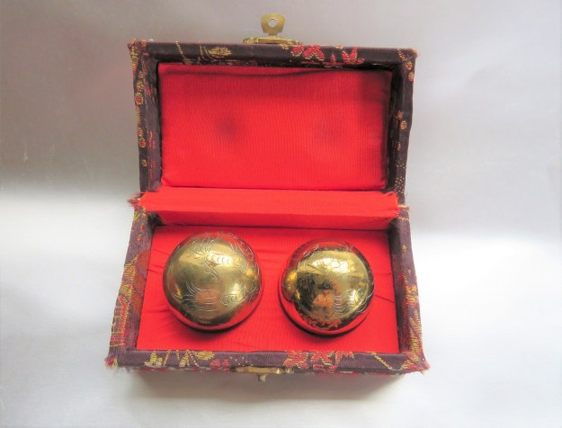 Reader, they are Chinese chiming balls that were all the fashion a few decades ago. The chimes still work. Maybe Taiwan 1970?