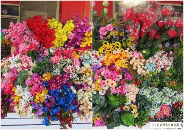 Ironically, on the opposite corner was this stand of fake flowers outside a Gold Coin shop.