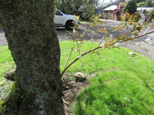 I photographed this small flowering growth on Prunus Pearly Shadows as an example of unwanted root stock shooting away, even on a very well-established tree. Many plants are budded or grafted onto other rootstock so that the desired cultivar can utilise the strength of strong growing root stock. Which is well and good when the rootstock is compatible and doesn’t escape. If you don’t cut off the root stock, it can overwhelm the grafted selection so it is best to see to it as soon as you spot it. How do I know it is rootstock? It is a single white; Pearly Shadow is a fluffy pink double and is not yet in flower.