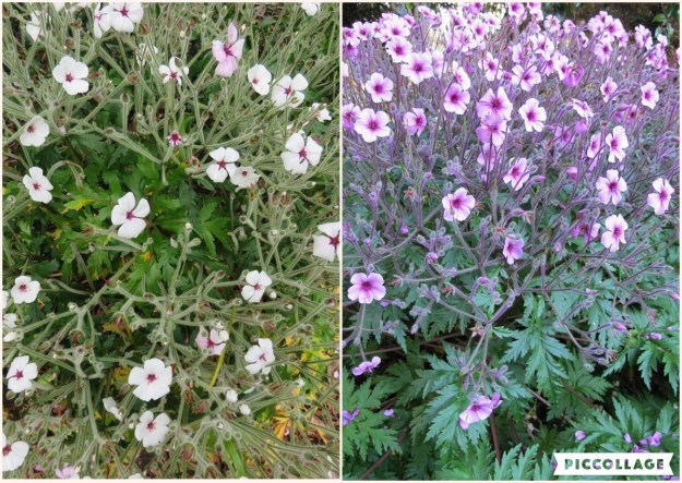 Geranium madarense – white(ish) to the left, the more usual cerise pink to the right