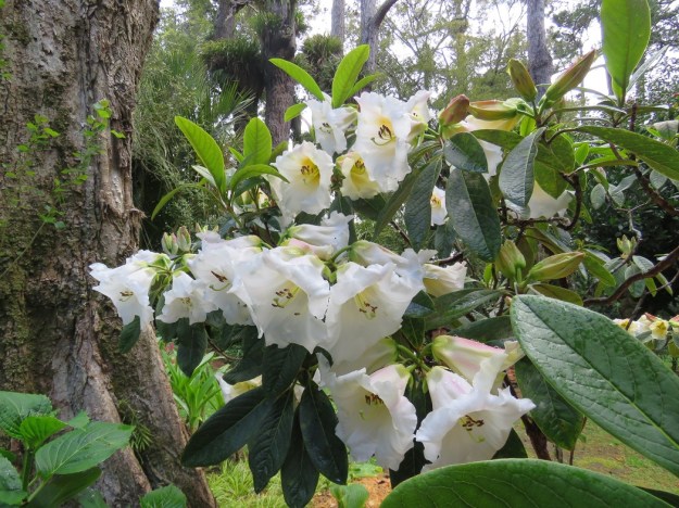At this point of mid spring, it is all about the rhododendrons and clivias. I am guessing that this handsome rhododendron that we relocated from the old vegetable garden six weeks ago is ‘White Waves’. It is one of the easier, scented nuttalllii hybrids to grow (R. nuttallii x {R. lindleyi x dalhousiae}) and a quick net search tells me it is still available for sale in NZ. We are very fond of the big nuttallii trumpet types though they are too tender for cold climates.