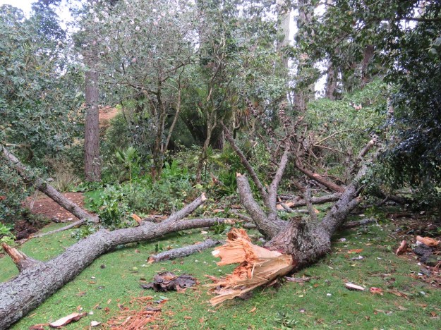Today is too windy with a cold southerly for me to garden but it snapped off another of our old man pines (P. radiata). As our treemageddons go, this is not a major one and most of it fell on the grass paths. We were drinking our morning coffee in the house when we heard it fall. In conditions like this, we do not linger long beneath these swaying, towering behemoths. We get through a prodigious amount of firewood each winter but I feel we should be onto storing away for the winter of 2022 by now.
