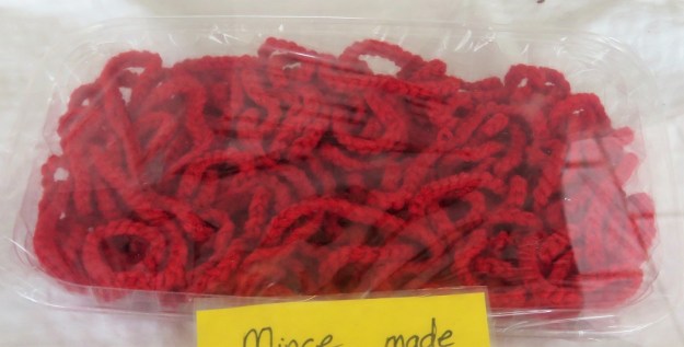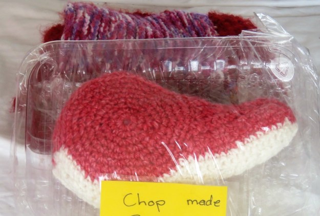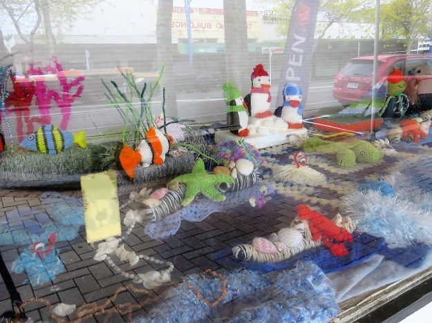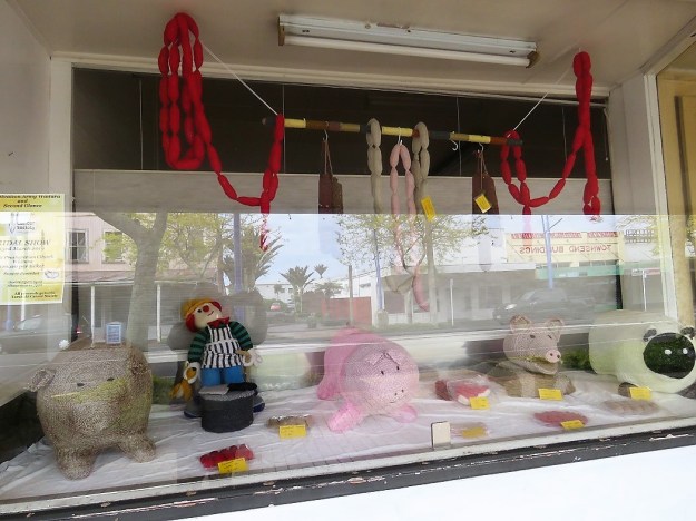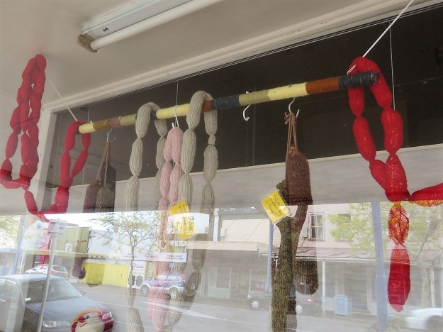 Away from gardening for this post. Our local town of Waitara never fails to surprise me. Over the last four decades or so, Waitara has suffered the fate of many small towns with a decline in retail outlets. Most of the main street retailers seem to be either takeaway food outlets or charity shops now with a fair representation of empty premises. So it was that I had failed to notice the window display in the disused butcher’s shop. Knitted meats!