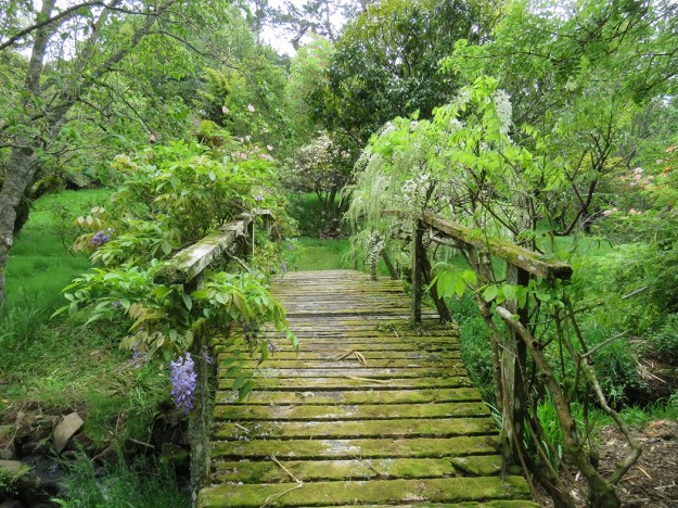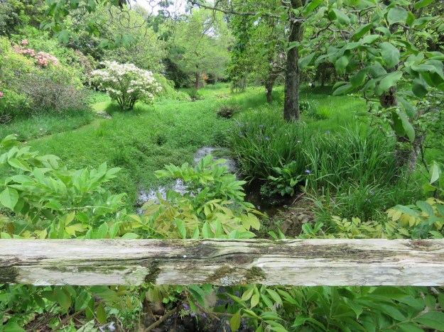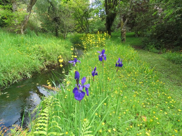 The next issue for us is to decide what to do with the two big ponds Mark put in back in the early 1990s. Our son raked them out last time he was home a couple of years ago but they are now congested with water weeds again. I have gone through every few years and raked the weeds out of the stream but it is heavy work and my back no longer appreciates it. All three of us here nurse our backs and wrists these days. I am now thinking that we live with what nature gives us. The stream flows well all year round so maybe we should just let it determine its own path and allow the ponds to silt up and return to bog or swamp. The irises, lysichitons and primulas are happy in bog conditions so maybe we are better to just concentrate of enriching the natural bog gardens rather than trying to keep a larger body of water visible. The stream is high in nutrients from dairy farm run-off (we can tell this by the particularly bright green shades of the weeds growing beneath the surface, as a water ecologist pointed out to us) so the water weeds will continue to thrive.