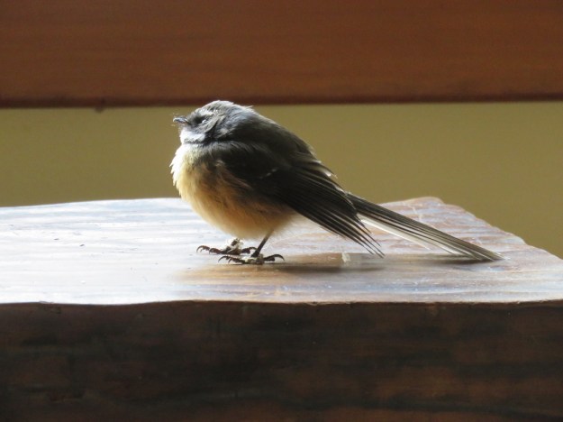 Albert may of course be Albertina. I tried searching how to tell a male piwakawaka from a female but failed to find anything definitive. The common name for these little native birds is fantail, on account of their tails which they hold out as full fanned fannies, really. They are notoriously difficult to photograph, being hyperactive, so these photos show just how chilled out Albert is indoors.