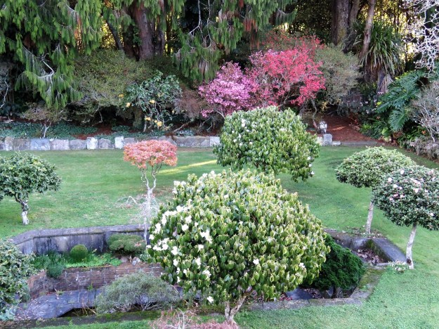 A midwinter view from an upstairs window. Azaleas, a vireya rhododendron, cyclamen and herbaceous begonia all in flower and camellias coming into bloom.