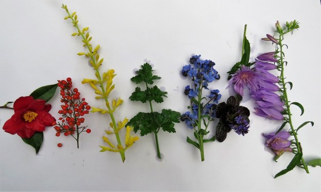 Confining myself to the rainbow hues left out all the pink and white blooms. We have a lot of pink and white in mid-winter but my foray into the pretty world of marshmallow tones will have to wait for another week. I may buy a packet of marshmallows to focus my thoughts on this very topic. I can not think that I have bought marshmallows since our children grew past the age of toasting them over a fire and that is a long time ago.