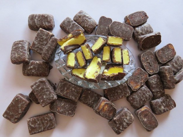 Tim Tams may be Australian, but I understand the pineapple lump is a New Zealand confection, in origin at least. For readers in other parts of the world, this is a pineapple-flavoured chewy centre coated in chocolate. Regular reader, Tim, who expressed a sudden desire for marshmallows after last week’s post, motivated me to repeat the exercise but in yellow and brown.