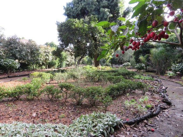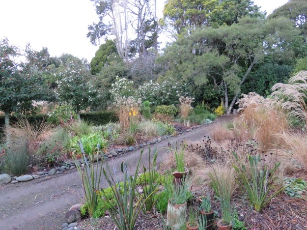 The twin borders are a good example at this time of year of how gardening here differs from the northern hemisphere. So much of the plant material we use is evergreen. Not for us the garden beds which are levelled to the ground with a strimmer or weed-eater and then covered in a blanket of mulch.