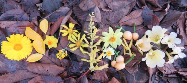 Inspired by the pineapple lump, on a bed of spent magnolia leaves we have yellow blooms of midwinter. Left to right: calendula, some yellow leafed shrubby plant I have little interest in so do not know the name, the first jonquil, corydalis, ligularia, salvia, primrose, the last of the dahlias, tubes of kniphofia, clivia seed, hemerocallis and vireya rhododendrons.