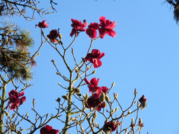 Magnolia Vulcan – the ragged flowers to the right will have been chewed by kereru