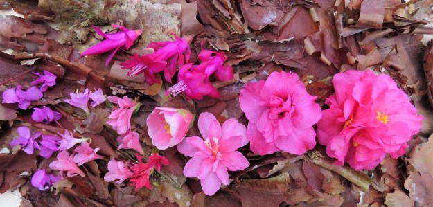 Cyclamen coum, schlumbergera, azaleas and camellias on a bed of Acer griseum bark