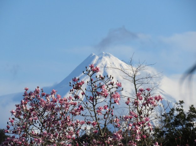 I was prophetic. Just two weeks ago I commented that bringing in a film crew from outside the area to capture our view of Magnolia campbellii and Mount Taranaki was fraught with problems, that we could go ten days without being able to see it. In fact it was fourteen days this time – a period of cloud and intermittent rain which kept te mounga shrouded. Yesterday was fine and sunny and the cloud over the peak cleared in the afternoon. Is there a lovelier sight?