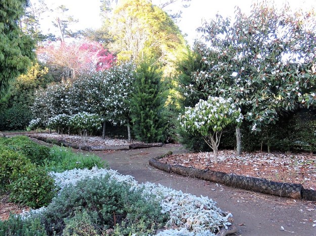 Major work includes laying a path surface in the new areas. Mark’s Fairy Magnolia White with Camellia yuhsienensis in front. The pink at the back is Prunus campanulata.