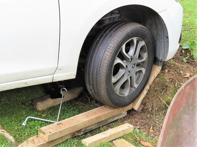 Lloyd to the rescue, though even the normally unflappable Lloyd was a little stressed by this situation. He didn’t want to pull it off with the tractor because that would have pulled the whole front bumper off the car so, ever resourceful, he sent the owner around the garden while he carefully and laboriously jacked up the car using timber bracing until he had it sufficiently clear to enable him to back it off, with no visible damage to the car. I think the visitor was grateful.