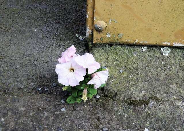 Not a lonely little petunia in an onion patch but a brave, little, self-seeded petunia flowering in a sea of ashphalt and concrete right beside the gutter. The seed must have fallen from a hanging basket above. A tiny beacon of hope and survival, maybe.