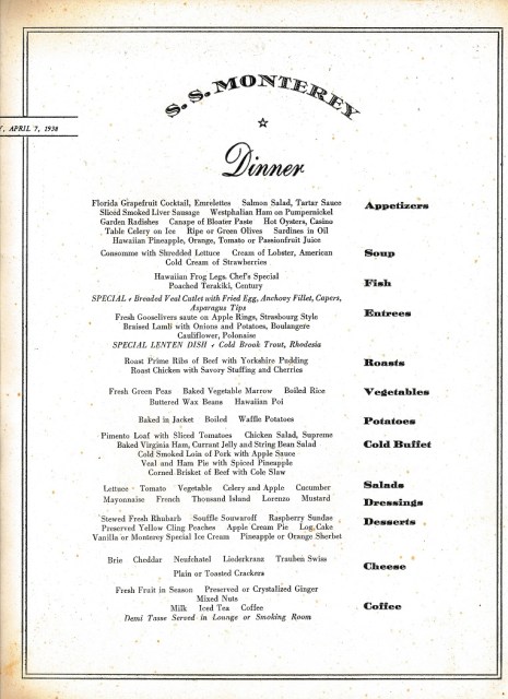The food menu is likely to have been table service but not cooked to order, looking at its contents. It certainly looks extensive and impressive, ranging from Hawaiian Frog Legs to Apple Cream Pie, but I think our ideas of gourmet food have evolved in the last 80 years. The appetizers contain such delights as Canape of Bloater Paste, Sardines in Oil, Smoked Liver Sausage and Emrelettes. I had to Google Emrelettes – a trademarked brand of tinned grapes that have been peeled and de-seeded, tinted green and flavoured with Crème de menthe. So now you know, too, in case it ever comes up in a quiz.
