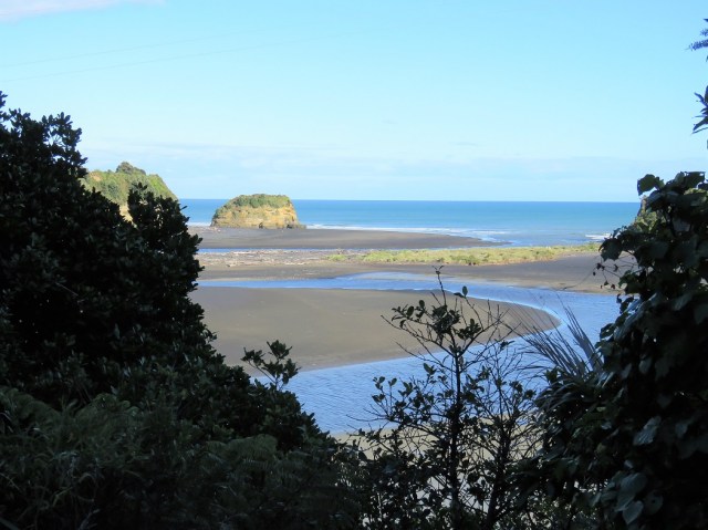 The view of the Tongaporutu tidal estuary is one that is near and dear to my heart. Mark’s parents built a bach there back in the late 1950s which we took over for a number of years. A bach, you may ask? A bach is the North Island term for what is called a crib in the South Island – modest precursors to what is now known as the more upmarket holiday house. This is an area that I know well. You may notice the black sand – iron sands are a feature of the Taranaki coastline. The sand gets so hot in summer that all locals know to wear footwear and – I am not exaggerating – if you take your dog to the beach with you, you have to carry the poor dog over the dry sand to avoid burning the pads on their feet! On sunny days.