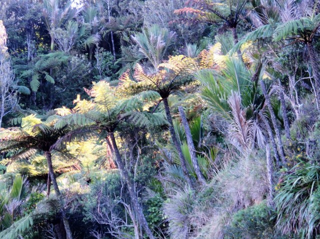 From the Uruti Valley just up the road from us and Mount Messenger (more hill with windy road than actual mountain), we enter ponga – native tree fern – territory but I didn’t stop to photograph them until I reached Tongaporutu. There, the regenerating native bush has a heady mix of nikau palms and pongas which are distinctively New Zealand in flavour.