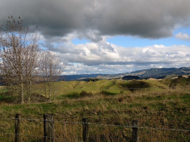 Once through the Awakino Gorge, we leave the coastal forest and sea behind to head inland and the countryside changes dramatically. This photo doesn’t do justice to what suddenly appears as big country, called the King Country – sparsely populated hillsides receding into the distance as far as the eye can see. It is a grand landscape in its own style.