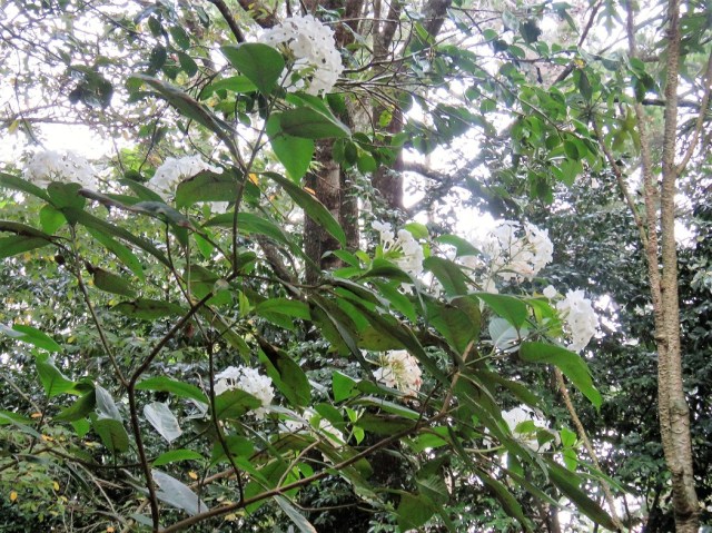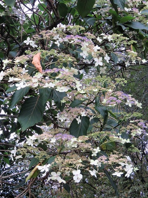 Also rangy and frost tender, the enormous, evergreen tree hydrangea is in full bloom. Walking past it on sunny days, the hum of honey bees is not quite deafening but certainly on track in that direction. As the plant is about 5 metres tall and currently sporting so many blooms on the sunny side that the foliage is barely visible, it can accommodate a whole lot of honey bees at a time when other food sources are less abundant. Last I heard, this unusual Chinese hydrangea is thought to be a member of the aspera group.
