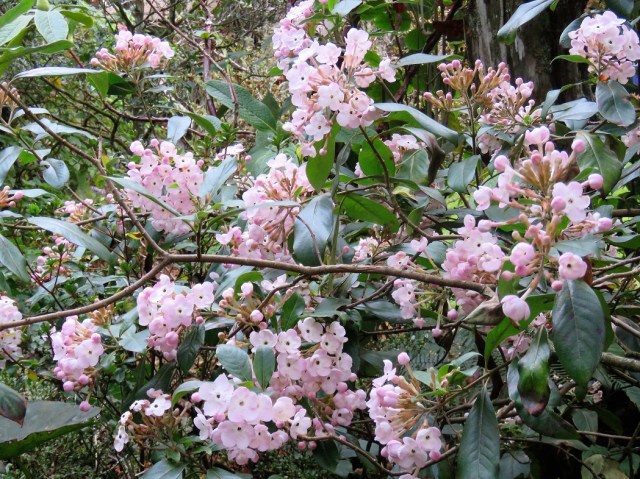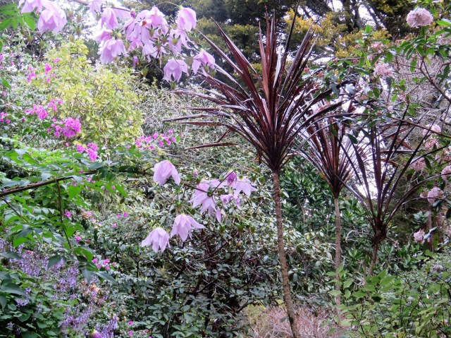 Nearby, still in the woodland area we call the Avenue Garden, I like this seasonal composition with the red form of Cordyline australis x banksii, the hanging chalices of the tree dahlia D. imperialis (another rangy, frost tender plant), the cerise of the enormous bougainvillea, blue flowered plectranthus and Luculia ‘Fragrant Cloud’ on the right.