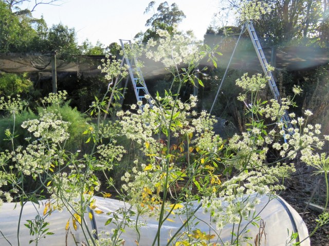Out in the rather wilder margins of Mark’s vegetable garden (which we never open to public view because while he is a productive gardener, he is also very messy in this area), the Ammi majus flowers on. I liked the mix of wildflower, the cloche and the communion of our two new ladders which Lloyd was using in tandem at the time.