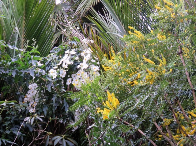 In still wilder margins, this scene was the coming together of a United Nations of self-seeded plants – the nikau palms from NZ, Montanoa bipinnatifida otherwise known as the Mexican tree daisy,and the yellow mahonia which may or may not be Mahonia japonica from Japan.