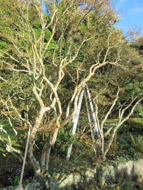 Mark and I have spent the better part of a week tackling the azaleas. Many of these are venerable old plants, mostly Kurume azaleas which are most often seen as low, tight buns smothered in flowers. Years ago, Mark made the call to limb up and thin, rather than to cut down and shape to tidy mounds. Our approach takes more work and we like the grace of the twisted stems which are white with lichen and the overhead carpet look. But, and it is a big but, that canopy needs ongoing work thinning and cleaning or it becomes a tangle of dead twiglets festooned in hugely excessive amounts of lichen. We had left this patch too long and it has been a major task to get it back. It is, Mark observed wryly after a day spent up the ladder carrying out microsurgery, one of those jobs nobody else will notice we have done. But we will notice and it will bring us renewed pleasure.