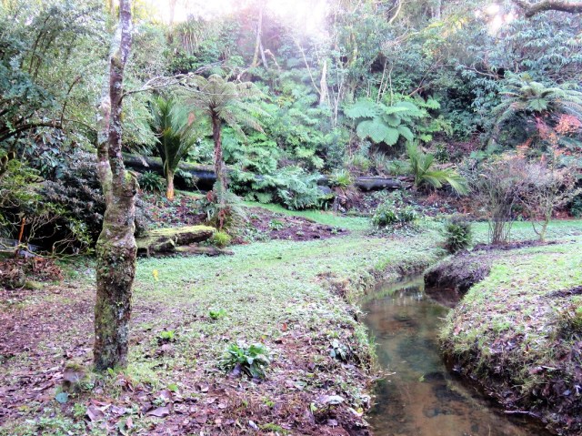 I wanted to incorporate the beds into the meadow we now manage in the park. Zach, bless his energy, enthusiasm and ability to pick up on ideas quickly, has taken on board the concept of blurring the lines between cultivated areas and wilder areas. Sharp demarcations in the garden belong in the most intensively maintained areas. I mean tightly defined edgings, of course. In the more naturalistic spaces, we find a softer transition pleasing to our eyes. The survivors of the original plantings are still there – some very good hostas, trilliums and interesting arisaemas in the main – but now they are interplanted with a hillside of yellow primulas relocated above the flood zone. More meadow than garden and much of the informal ponga edging (lengths of tree fern trunks) has been removed so the meadow grass and buttercups can invade, as it will anyway. I am looking forward to spring to see how seamless it will appear.