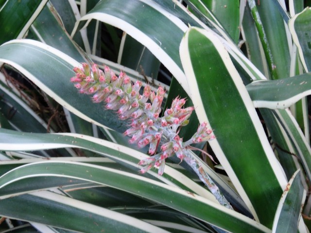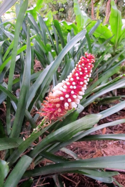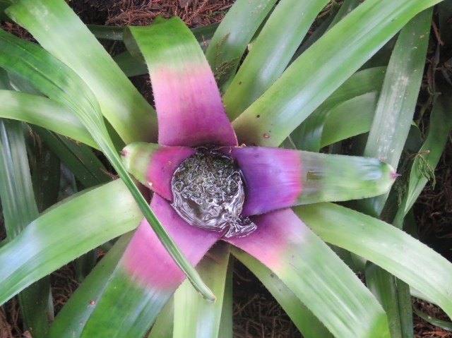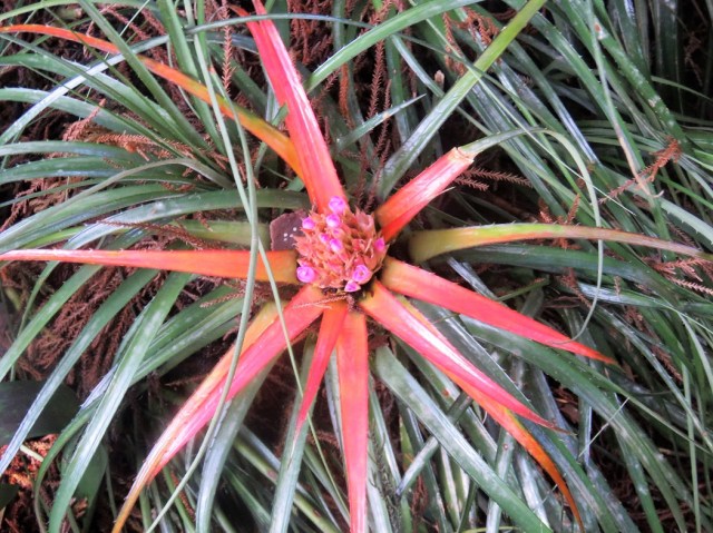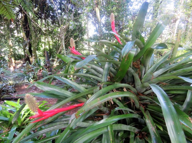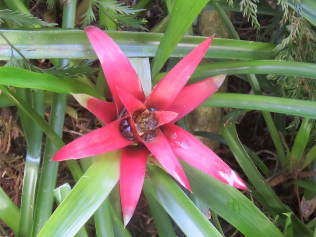 It is a complex planting but bromeliads feature large. It is not that we have a choice collection of bromeliads. Our interest lies solely in them as garden plants in a shaded, borderline-sub-tropical situation so that limits the range we can grow. Broms are a huge family and largely from the tropical areas of the Americas. The best-known bromeliad is of course the pineapple. I have something of an aversion to prickly plants and many broms are prickly. Their flowering, while undeniably exotic and interesting, doesn’t make my heart sing like some other plants. So my knowledge of them is limited to caring for the ones we have and I have never felt motivated to get to grips with the whole plant family, botanically speaking.