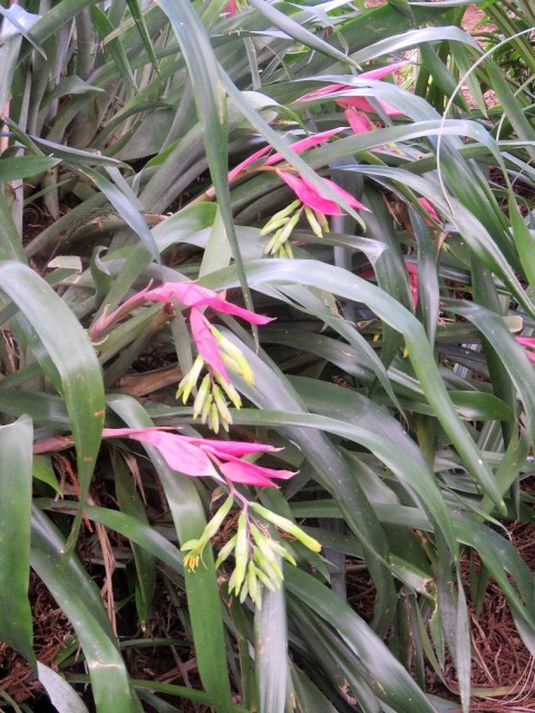I had a mental debate with myself as to whether I could post my few photos of those currently in flower in the area where I am working without naming them – by general group if not cultivar. Well, we have long since lost the cultivar names. I have never committed bromeliad groups to memory but I feel I am lowering standards if I don’t name plants here so feel free to correct me on the classifications. We are by no means certain on them. Postscript: I have done a round of corrections on the photo caps after receiving advice from a reader who knows a whole lot more about bromeliad botany and nomenclature than we do.