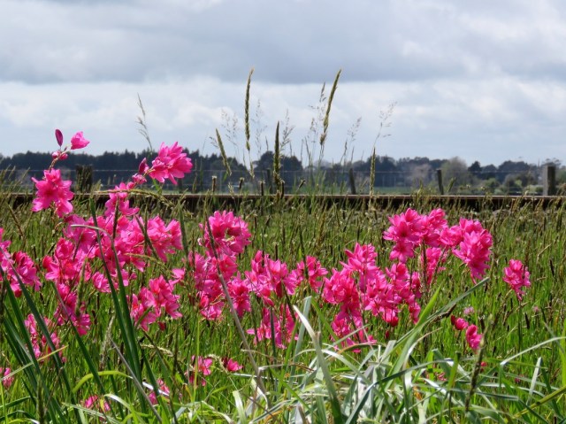 I flashed past these eye-catching ixias (corn lilies) at speed and promptly thought that I should have stopped and photographed them. I then thought I couldn’t be bothered until a couple of kilometres down the road when I turned and went back. Are they not pretty? They are growing on wasteland beside the railway in Lepperton and the sight of them stopped me being grumpy about something else that had happened.