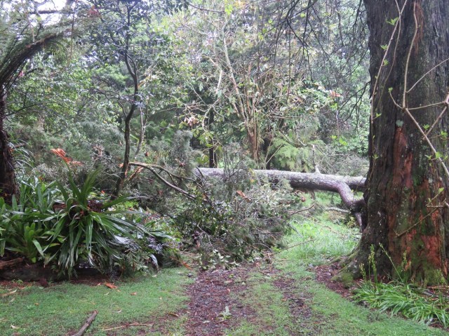 The mystery to us is when it fell because neither of us heard it. I walked up that path mid afternoon on Friday. Mark found the fallen tree late afternoon on Saturday. So there is a 25 hour time frame and in that period, there was rain but no wind. There would have been a loud crack, the sound of breaking branches and then a loud whoomp when it hit the ground. But we heard and felt nothing. Mark thinks it must have happened at night when we were both in deep sleep but I am sure we would have woken because it is not that far from the house. I think it must have happened when I was out shopping on Saturday morning and Mark was working in the shed with the radio on. He is adamant he would have heard it and felt the vibration. Maybe it thought nobody was here to hear it so it did not make a sound? (*Philosophy joke.)