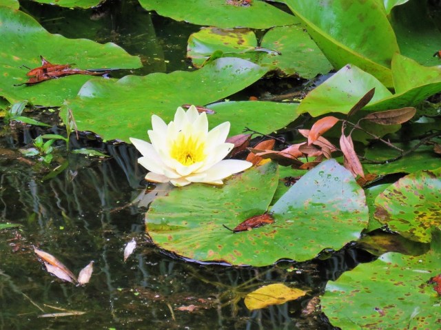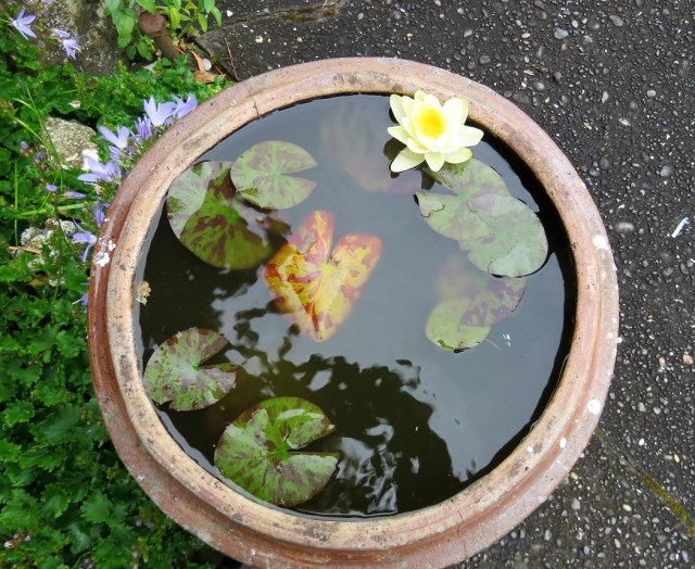 From the look of both flower and leaf the one that got the reprieve could be Nymphaea ‘Marliacea Chromatella’, one of the first hybrids bred by Joseph Latour-Marliac in France (around 1880 I think). We used to have one, but the ducks that frequent our pond destroyed that plus several others, so we only have 4 or 5 varieties now. All are hardy, but they have no doubt been crossed with tropicals in their breeding to get the colour range and 3 of ours grow their flowers on stems that hold them varying amounts above the water. I counted them yesterday: about 100 flowers open at the moment, but a lot more buds showing too. They have never flowered this well before.