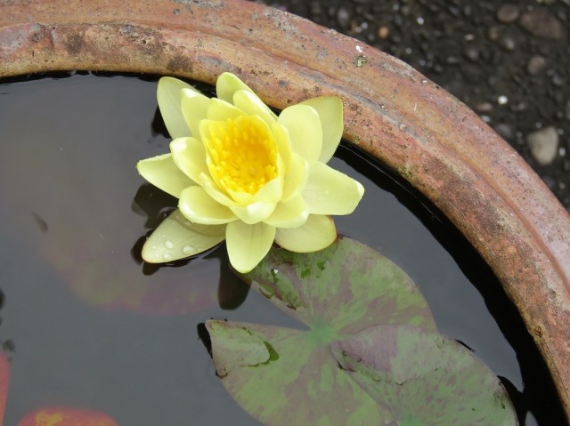 If I believed in woo-woo (or, at least, that plants can sense what humans are saying), I might think that the appearance of this charming, little lemon water lily flower was because of my threats made over the past few months. The plant came into our possession about ten years ago and it has lived in a vintage pot ever since without flowering. Maybe three years ago, I took it out, reduced some bulk, raised it higher in the pot and gave it some new compost mix. Nothing happened. It just put up its usual leaves. I declared this year – probably in its hearing – that this was its last year. If it didn’t flower, I would cast it out and find something more obliging to grow instead.