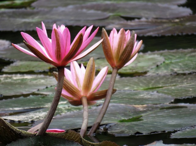 Well, it has to be a sunny day and the sun has to have been on them for a few hours too. They all close at night. But we’re impressed too. They probably cover about 20-25% of the pond surface between them, so still plenty of room for the ducks and the frogs to swim about.