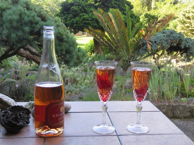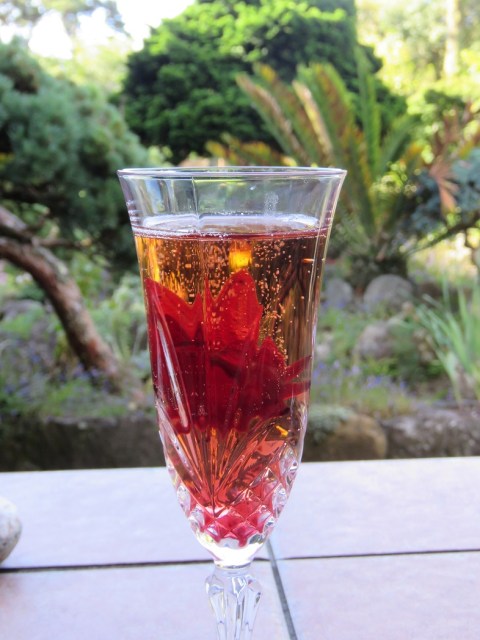 If you look closely, you will notice the red flowers in our glasses of bubbly. These came in a small jar, labelled ‘Wild Hibiscus Flowers in Syrup’, part of a Christmas package of goodies from our Sydney daughter. These are new to us although, looking on the internet, I am guessing more urban readers who lead sophisticated lives which involve cocktail bars and upmarket restaurants may have met them before. My local supermarket – Waitara New World – does not run to stocking wild hibiscus flowers in syrup, being more utility in character.