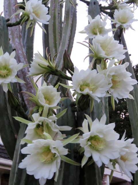On another topic, I usually photograph the towering Trichocereus pachanoi against a blue sky. But as the evening draws in, the flowers open fully and the scent hangs heavy in the air even several metres from the plant. Night-scented flowers are usually an indicator that the plant is pollinated by moths.